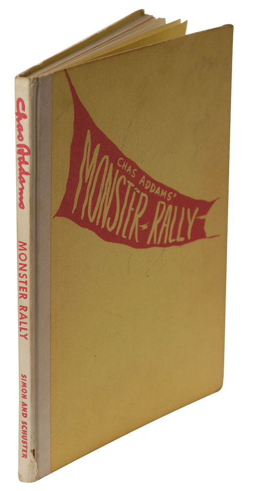 Signed book: Charles Addams' Monster Rally. Later printing. NY: Simon & Schuster, 1950. Hardcover, 8.5 x 11.25, 91 pages. Signed and inscribed on the first free end page in black felt tip, “For Mrs. Schaefer, with happy memories, Chas. Addams, 1970,” beside a fantastic full-length sketch of Gomez Addams. Autographic condition: fine, with a slight brush to the date. Book condition: VG/None. Yellow paper-covered boards with white cloth-covered spine; edges worn, with small tears at corners and spine-ends (largest is approx. 1 inch to right edge of spinetail); moderately soiled/yellowed; gentle bump at spinehead. Binding is tight and interior is clean. An exceptional and uncommon example of Addams’s work, this is the first sketch of Gomez that we have ever offered. Pre-certified PSA/DNA and RR Auction COA.