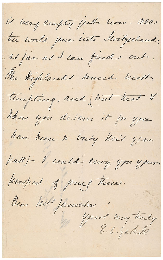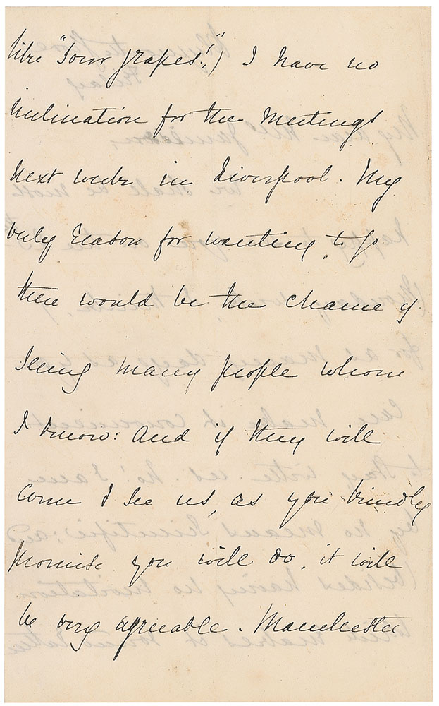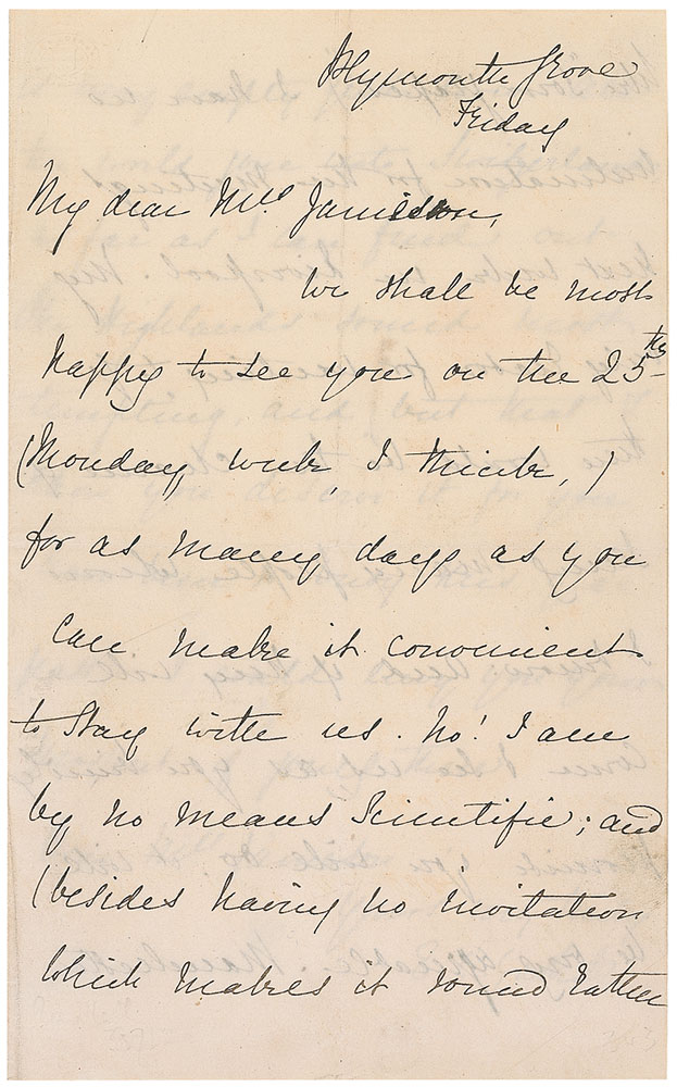Victorian-era author (1810–1865) whose works detailed the lives of people in all classes of society; best known for her novel North and South. ALS signed “E. C. Gaskell,” three pages on two adjoining sheets, 4.5 x 7.25, [September 1854]. Letter to a friend. In part: “We shall be most happy to see you…for as many days as you can make it convenient to stay with us. No! I am by no means scientific; and besides having no invitation…I have no inclination for the meetings next week in Liverpool.” Period notation to reverse in another hand dates the letter to September 1854. In fine condition, with central vertical and horizontal folds and some mild soiling. RR Auction COA.