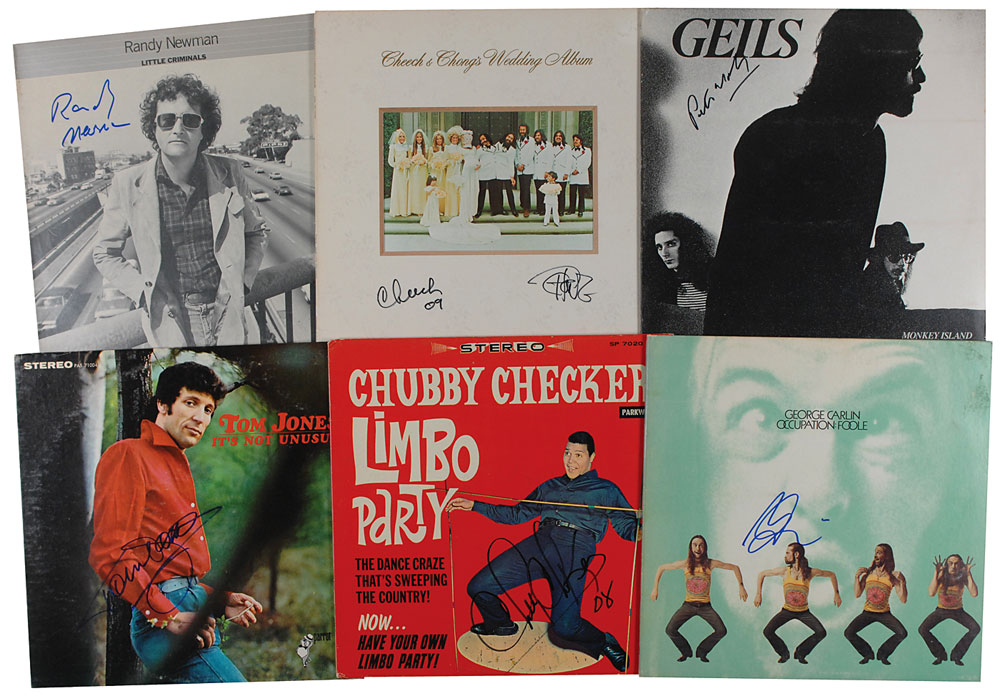 Six albums signed on the front cover in blue or black felt tip by the associated artist. Signers are: Tom Jones (It’s Not Unusual); George Carlin (Occupation: Foole); Peter Wolf (Geils); Cheech Marin and Tommy Chong (Cheech & Chong’s Wedding Album); Randy Newman (Little Criminals); and Chubby Checker (Limbo Party). All of the records are included. In overall fine condition. RR Auction COA.