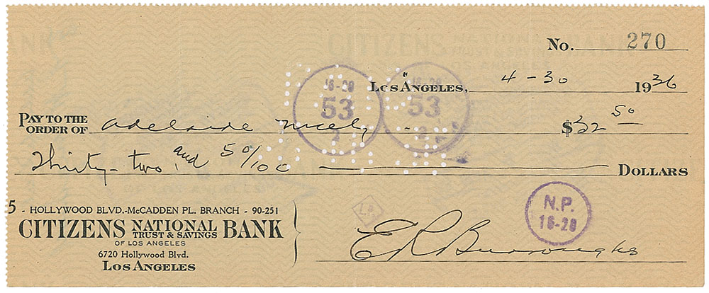 Bank check, 7.75 x 3, filled out and signed by Burroughs, “E. R. Burroughs,” payable to Adelaide Nicely for $32.50, April 30, 1936. Three vertical folds, one through a single letter of signature, and expected cancellation holes and stamps, otherwise fine condition. Accompanied by an unsigned glossy 8 x 10 photo. RR Auction COA.