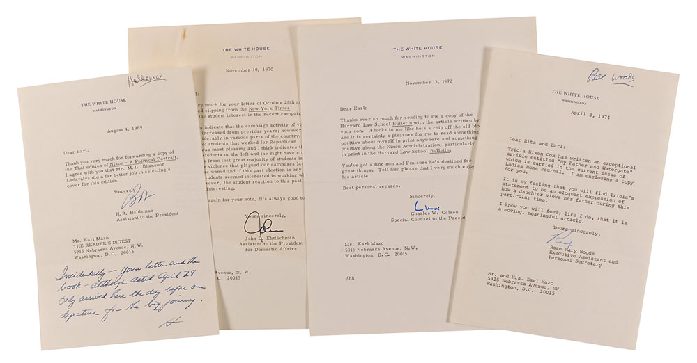 Four one-page TLSs, all on White House letterhead, ranging in date from 1969 to April 3, 1974, all written to Richard Nixon’s friend and biographer, Earl Mazo, each signed by a different staff member involved in the Watergate scandal. Letters are from H. R. Haldeman, signed “Bob”; John Erlichman, signed “John”; Charles W. Colson, signed “Chuck”; and Rose Mary Woods, signed “Rose.” In very good to fine overall condition. RR Auction COA.