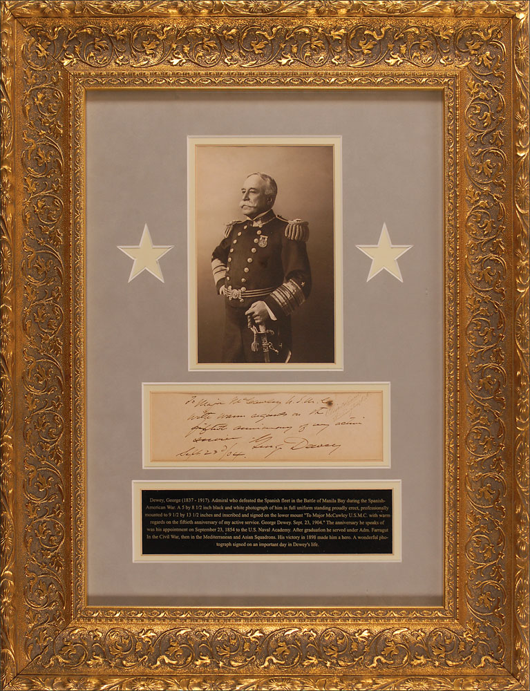 Ink signature and inscription, “To Major McCawley U.S.M.C. with warm regards on the fiftieth anniversary of my active service, George Dewey, Sept. 23, 1904,” on an off-white 8 x 2.5 photographer’s mount. Double-suede-matted and framed with a portrait of Dewey and a biographical plaque to an overall size of 18 x 24. A small spot near top and a photographer’s pencil notation to right side, otherwise fine condition. RR Auction COA.