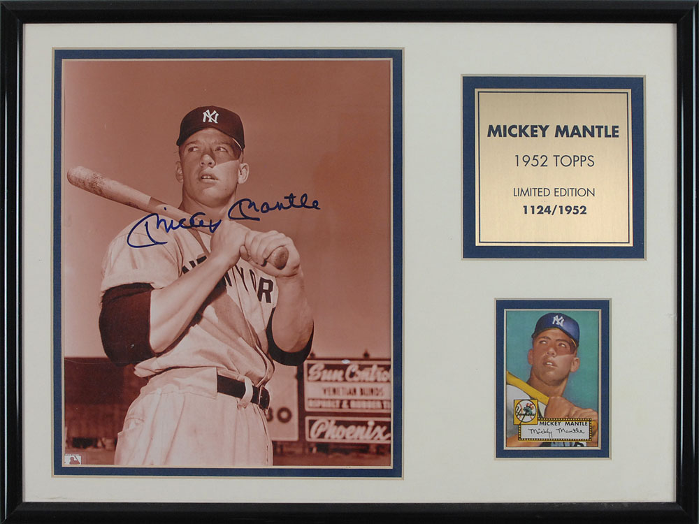 Limited edition glossy 8 x 10 photo of Mantle from his rookie year in 1952, numbered 1124/1952, signed in blue felt tip. Double-matted and framed with a plaque and a reproduction of Mantle’s Topps rookie card to an overall size of 16.25 x 12.25. In very fine condition. Pre-certified Steve Grad/PSA/DNA and RR Auction COA.