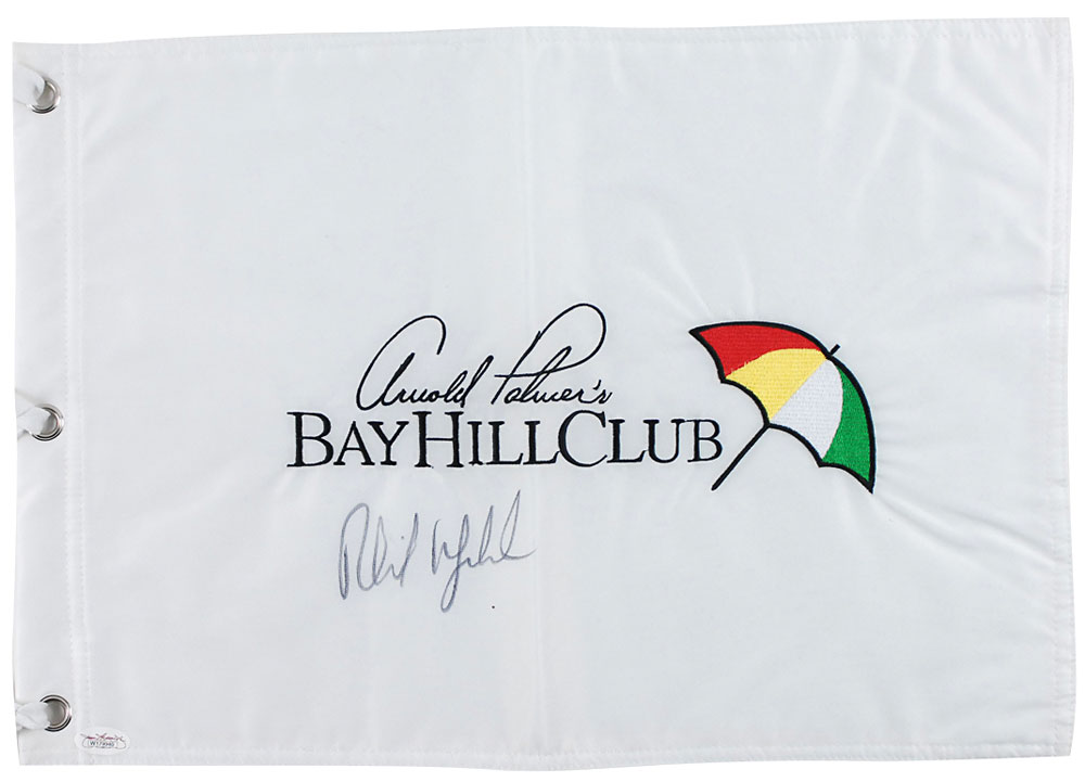 Souvenir Arnold Palmer’s Bay Hill Club golf flag, 18.5 x 13, signed in black felt tip on the front. In fine condition. Accompanied by a certificate of authenticity from James Spence. Pre-certified Steve Grad/PSA/DNA and RR Auction COA.