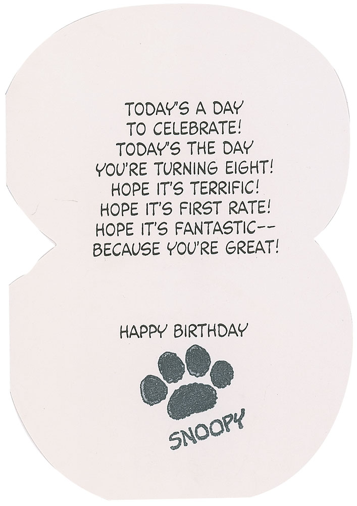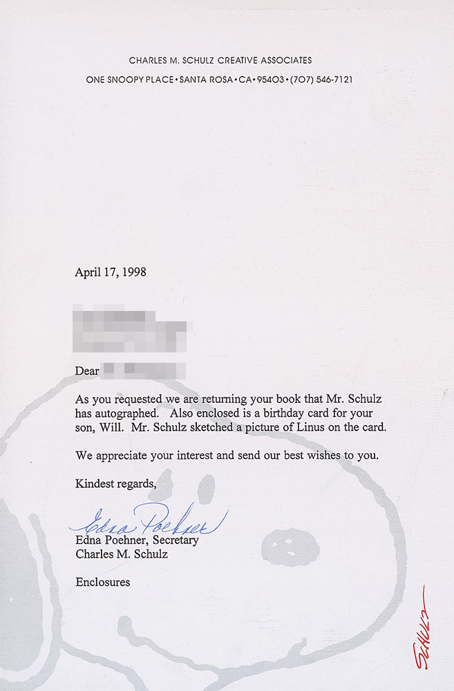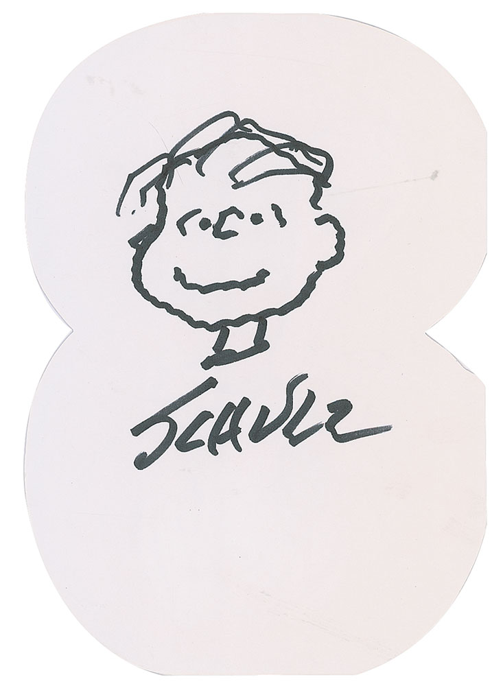 Terrific birthday card for an 8-year-old featuring an image of Snoopy, 4.75 x 7, inside which Schulz has sketched a felt tip portrait of Linus and signed below, “Schulz.” In very fine condition. Accompanied by a letter of transmittal from his secretary which states, “Enclosed is a birthday card for your son, Will. Mr. Schulz sketched a picture of Linus on the card.” Pre-certified PSA/DNA and RR Auction COA.