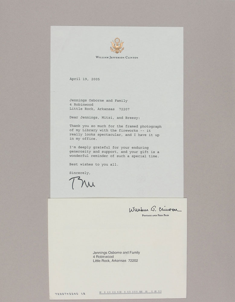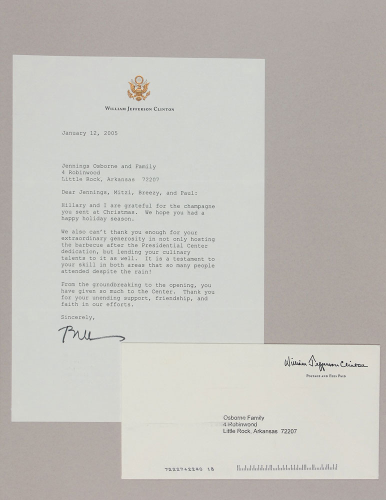 Two letters: TLS signed “Bill,” one page, 7.25 x 10.5, personal letterhead, January 12, 2005. In part: “Hillary and I are grateful for the champagne you sent at Christmas…We also can’t thank you enough for your extraordinary generosity in not only hosting the barbecue after the Presidential Center dedication, but lending your culinary talents to it as well. It is a testament to your skill in both areas that so many people attended despite the rain!”; and a TLS signed “Bill,” one page, 6.25 x 8, personal letterhead, April 19, 2005. In part: “Thank you so much for the framed photograph of my Library with the fireworks—it really looks spectacular, and I have it up in my office.” Both letters are securely affixed with their original mailing envelopes to opposite sides of an 11.75 x 14.5 scrapbook page. In overall fine condition. Pre-certified PSA/DNA and RR Auction COA.