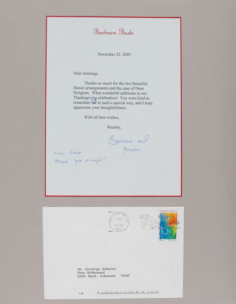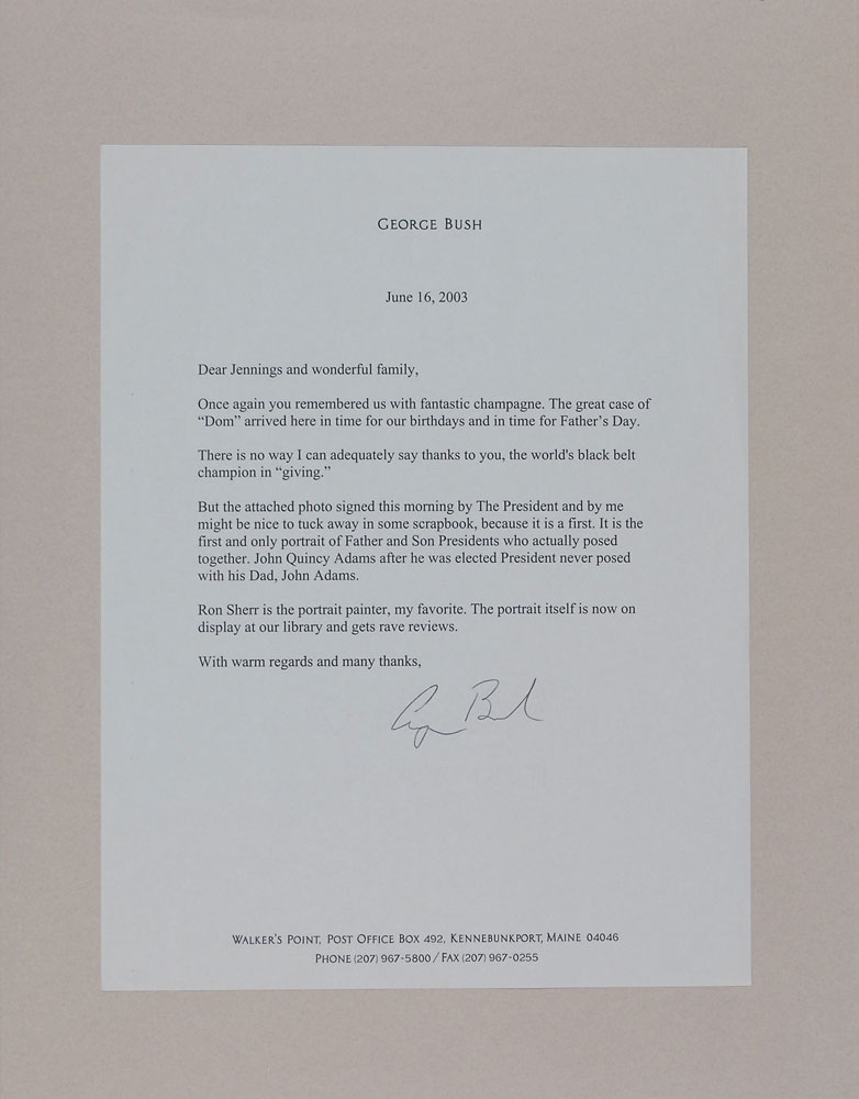 Two letters: one TLS signed “George Bush,” one page, 8.5 x 11, personal letterhead, June 16, 2003. In part: “The attached photo signed this morning by The President and by me…is a first. It is the first and only portrait of Father and Son Presidents who actually posed together, John Quincy Adams after he was elected President never posed with his Dad, John Adams”; and a TLS signed by Barbara Bush, “Barbara and George,” one page, 6.25 x 8.5, personal letterhead, November 25, 2003. In part: “Thanks so much for the two beautiful flower arrangements.” Both letters are securely affixed to opposite sides of an 11.75 x 14.5 scrapbook page. In overall fine condition. RR Auction COA.