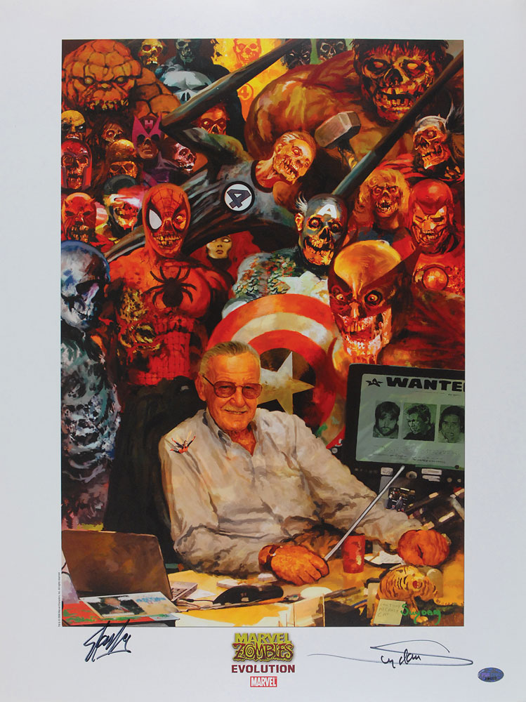 Unusual and neat color 18 x 24 print entitled ‘Marvel Zombies Evolution,’ signed in the lower border in black felt tip. In fine condition, with a PSA/DNA authentication label affixed to lower corner. Accompanied by a certificate of authenticity from PSA/DNA. RR Auction COA.