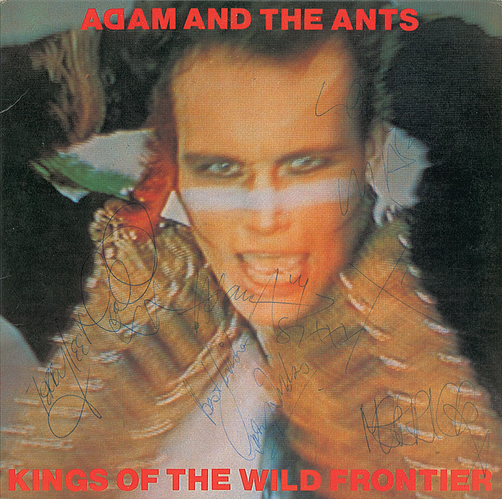 Promotional copy of his Kings of the Wild Frontier album signed on the front cover in blue ballpoint by Adam Ant, adding “81 xxx,” Terry Lee Miall, Marco Pirroni, Chris ‘Merrick’ Hughes, and Gary Tibbs. In fine condition. The record is included. Obtained in person in 1981 when the band appeared on NBC’s The Tomorrow Show with Tom Snyder and accompanied by a letter of provenance from the original recipient. RR Auction COA.