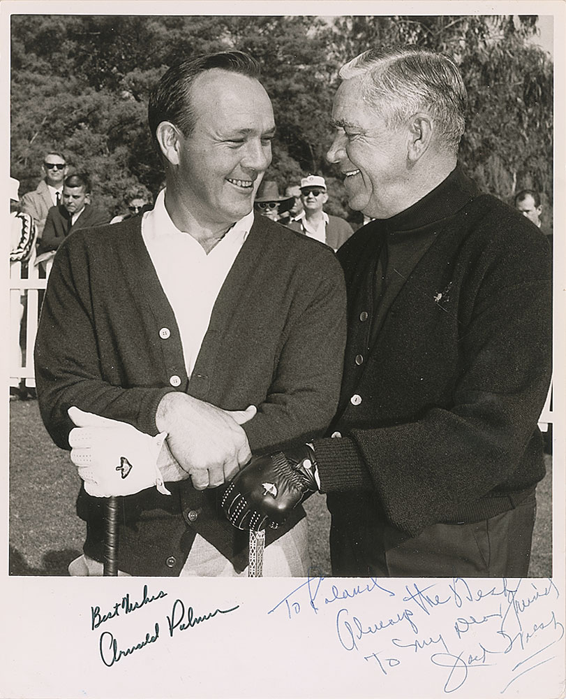 Glossy 8 x 10 photo of Palmer posing with another golfer, signed in the lower border in black felt tip, “Best wishes, Arnold Palmer,” and also signed and inscribed in blue ballpoint by the second golfer. In fine condition. Pre-certified Steve Grad/PSA/DNA and RR Auction COA.