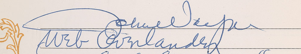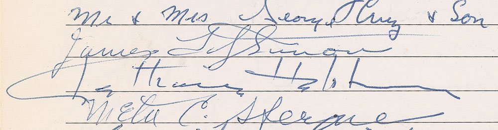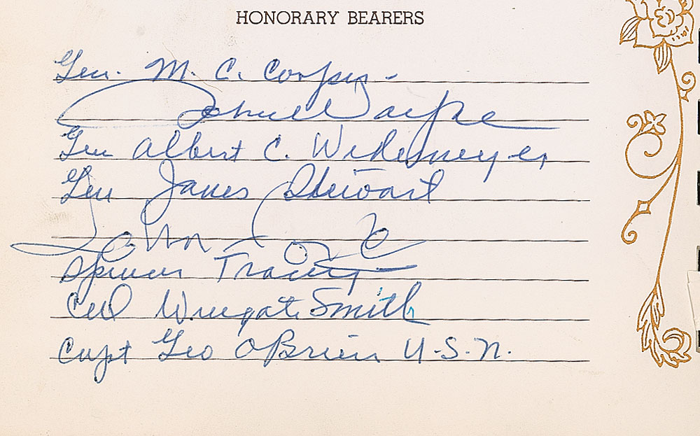 The hardcover spiral-bound memorial book from Pennick’s 1964 funeral is signed inside by over 150 attendees, including honorary pall bearers John Wayne, John Ford, James Stewart, George O’Brien, Wingate Smith, and Spencer Tracy; along with attendees Katharine Hepburn, Robert Wagner, Donald Crisp, Frank Pershing, Hank Worden, Carlton Young, Slim Hightower, again by John Wayne, Bill Henry, and many other actors and studio crew. A photo album from the service at the John Ford Field Photo Memorial Home contains 20 photos from the ceremony, highlighted by a couple showing Wayne as an honorary pall bearer, a couple of John Ford giving the eulogy, and one of Donald Crisp reading the 23rd Psalm. The remainder show Pennick’s casket, attendees paying their respects, and the casket being taken to a hearse by the pall bearers. Also included are approximately 28 other photos of various sizes from Pennick’s professional and military life, including one of Pennick with John Wayne, one with John Ford, one from the set of The Alamo (for which he was hired to drill the military extras), and several of Pennick while serving in the military. In overall very good to fine condition. An impressive collection of Hollywood heavyweights paying tribute to a well-loved and respected colleague. RR Auction COA.