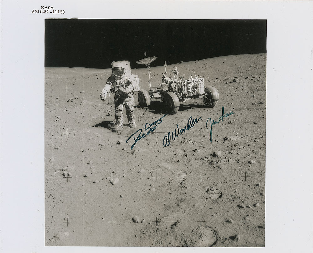 Uncommon glossy 10 x 8 NASA photo of Dave Scott walking away from the lunar rover during the Apollo 15 mission, signed in black felt tip by Dave Scott, Al Worden, and Jim Irwin. In very fine condition. Pre-certified Steve Zarelli.
