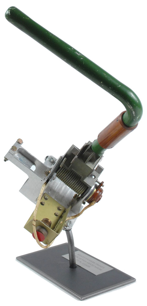 Lever from one compartment of the Soyuz 7K-L1 moon flyby spacecraft living module. Component measures approximately 7.5 x 12 x 9 and is dominated by the large green hand lever, numbered in red paint “33A.” Component is attached to a vertical display stand with a descriptive plaque affixed to the base. The ‘Zond’ spacecraft was designed to launch men from the Earth to circle the Moon and return without going into lunar orbit. The first manned flight of the L1 spacecraft was planned for late 1968 or early 1969 with cosmonauts Alexei Leonov and Valery Bykovsky. However, only unmanned flights were made, with four of the five test flights resulting in catastrophic malfunctions. After the successful Apollo 8 flight around Moon, the Soviet manned moon flyby missions lost political motivation and the program was closed in 1970 without the achievement of its primary goal. RR Auction COA.