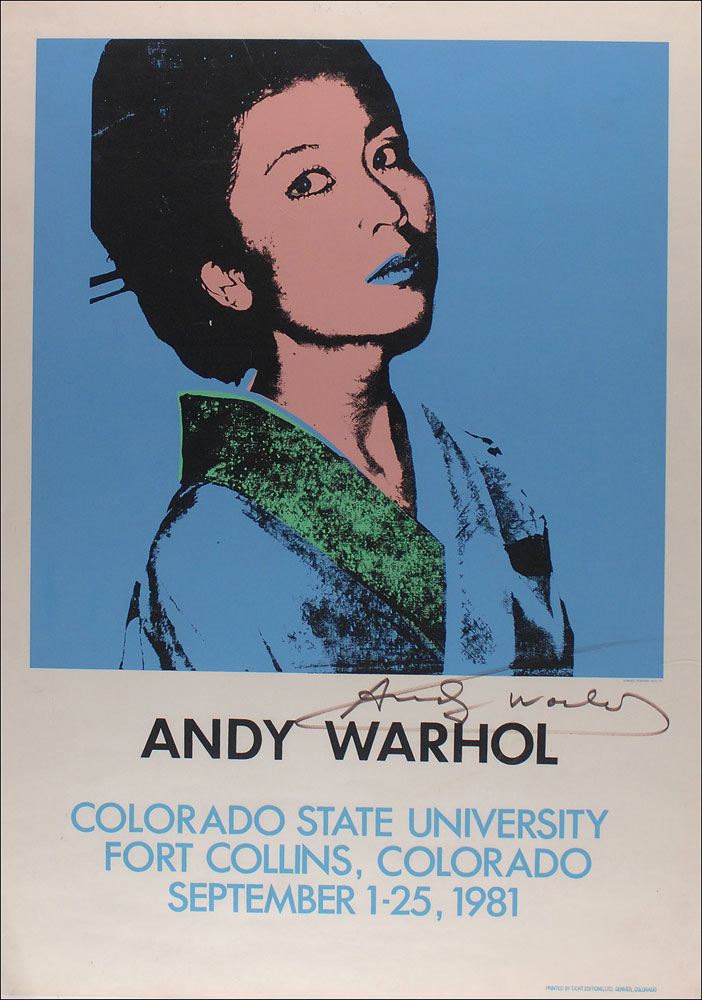 Original color 25 x 35 thick stock poster print of Kimiko Powers done for his Colorado State University exhibition from September 1 to 25, 1981, printed by Licht Editions, Ltd., of Denver, enthusiastically signed in Warhol’s typical thick black felt tip. Scattered dings and tack holes to borders, otherwise fine condition. Accompanied by a series of photos of a 1983 Warhol exhibition from the original collector, who obtained the signature in person at the event. An uncommon and highly desirable poster, even in unsigned form. Pre-certified PSA/DNA and RR Auction COA.
