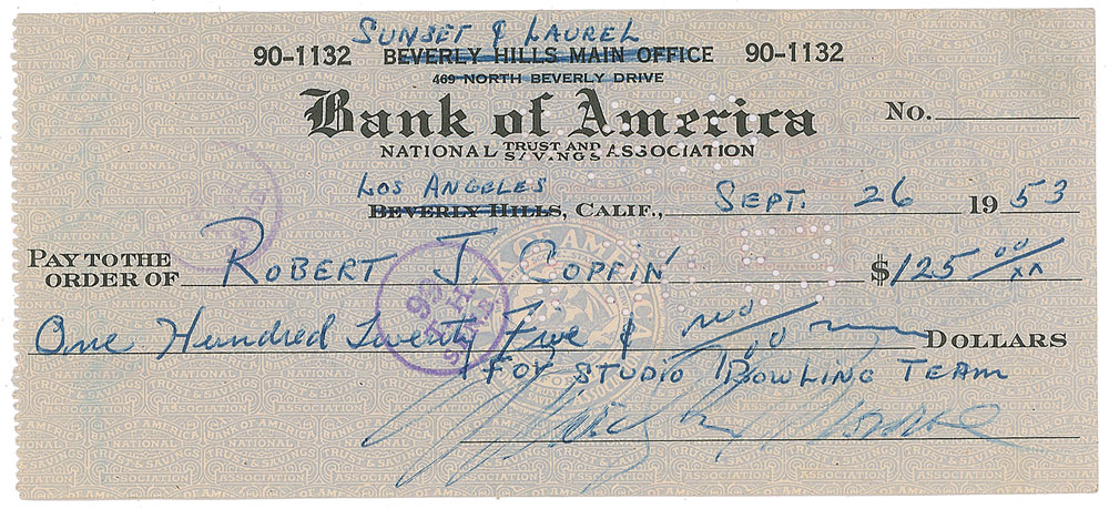 Bank check, 5.75 x 2.5, filled out in another hand and signed by Monroe, payable to Robert J. Coppin for $125.00, September 26, 1953. The check’s address has been corrected in an unknown hand and also bears a notation, “Fox Studio Bowling Team.” Three vertical folds, one through a single letter of signature, expected cancellation stamps and holes, and Marilyn’s signature just a shade light, otherwise fine condition. Pre-certified PSA/DNA and RR Auction COA.