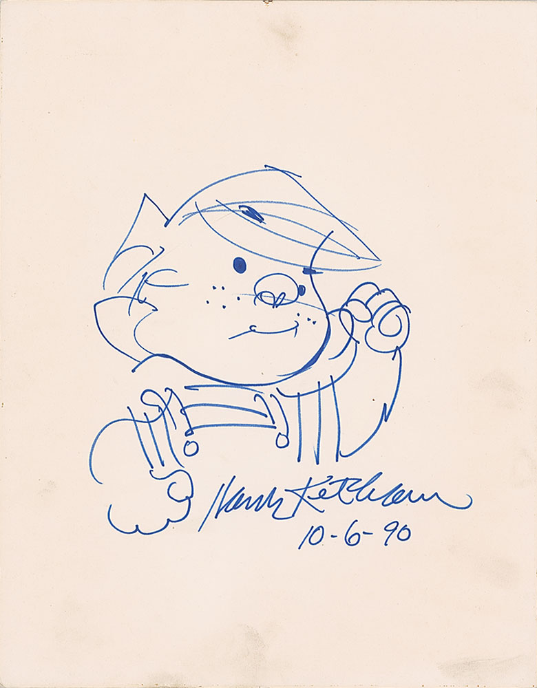 Large original signed felt tip sketch of Dennis the Menace on an off-white 11 x 14 sheet, signed, “Hank Ketcham, 10-6-90.” In fine condition, with light scattered soiling. RR Auction COA.