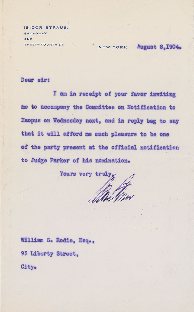 The founder of Macy’s department store and Titanic casualty. Straus’ wife, Ida, refused to board a lifeboat, returning to her husband, saying ‘I will not be separated from my husband. As we have lived, so we will die together.’ When both were offered the safety of a lifeboat, he firmly replied, ‘I will not go before the other men.’ Rare TLS, one page, 4.75 x 8, personal letterhead, August 8, 1904. In full: “I am in receipt of your favor inviting me to accompany the Committee on Notification to Esopus on Wednesday next, and in reply beg to say that it will afford me so much pleasure to be one of the party present at the official notification to Judge Parker of his nomination.” In fine condition, with some slight spreading to typed text. Ex. Brian Green Collection. RR Auction COA.