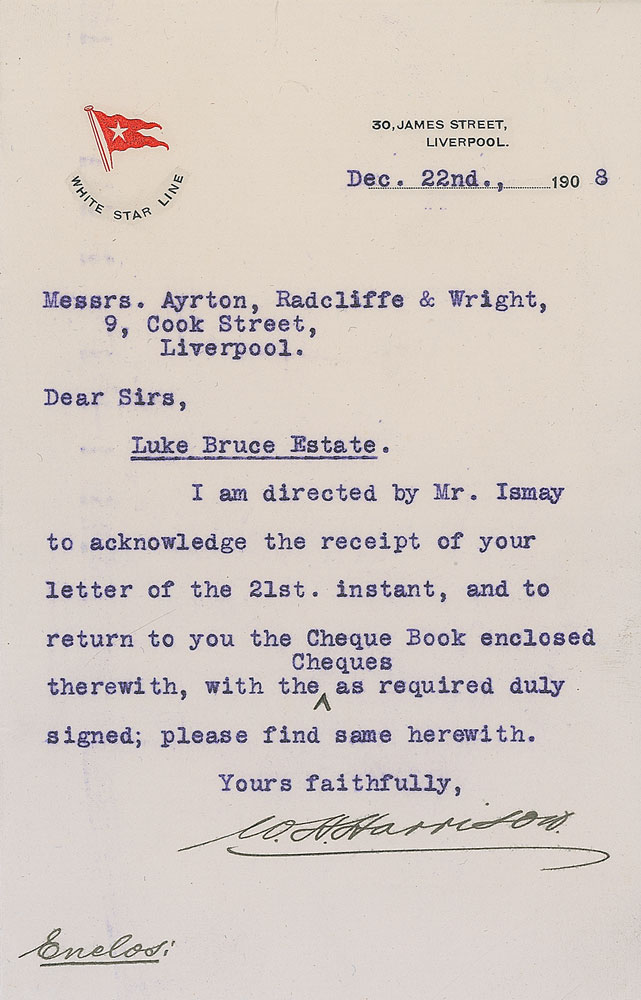 Secretary to Bruce Ismay (1872-1912), Harrison perished in the sinking of the Titanic. TLS signed “W. H. Harrison,” one page, 4.5 x 7, embossed White Star Line letterhead, December 22, 1908. Letter to Mssrs. Ayrton, Radcliffe, and Wright concerning the Luke Bruce Estate. In full: “I am directed by Mr. Ismay to acknowledge receipt of your letter of the 21st. instant, and to return to you the Cheque Book enclosed therewith, with the Cheques as required duly signed; please find same herewith.” In fine condition. Although Ismay was rescued, his private secretary as well as his valet, perished in the sinking. Harrison’s wife had requested that his body be shipped home to England but her wishes were not followed. His was the first body buried at Fairview Lawn on May 1, at All Saints Cathedral. It is possible the White Star Line officials wanted to set an example so that every family did not request that bodies be shipped around the world. Ex. Brian Green Collection. RR Auction COA.