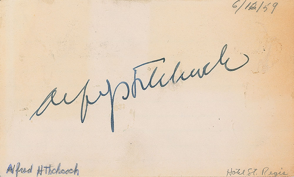 Bold vintage fountain pen signature, “Alfred Hitchcock,” on an off-white 5 x 3 card with a June 12, 1959, collector’s notation. In very good condition, with irregular blocks of toning and scattered adhesive remnants. Pre-certified PSA/DNA and RR Auction COA.