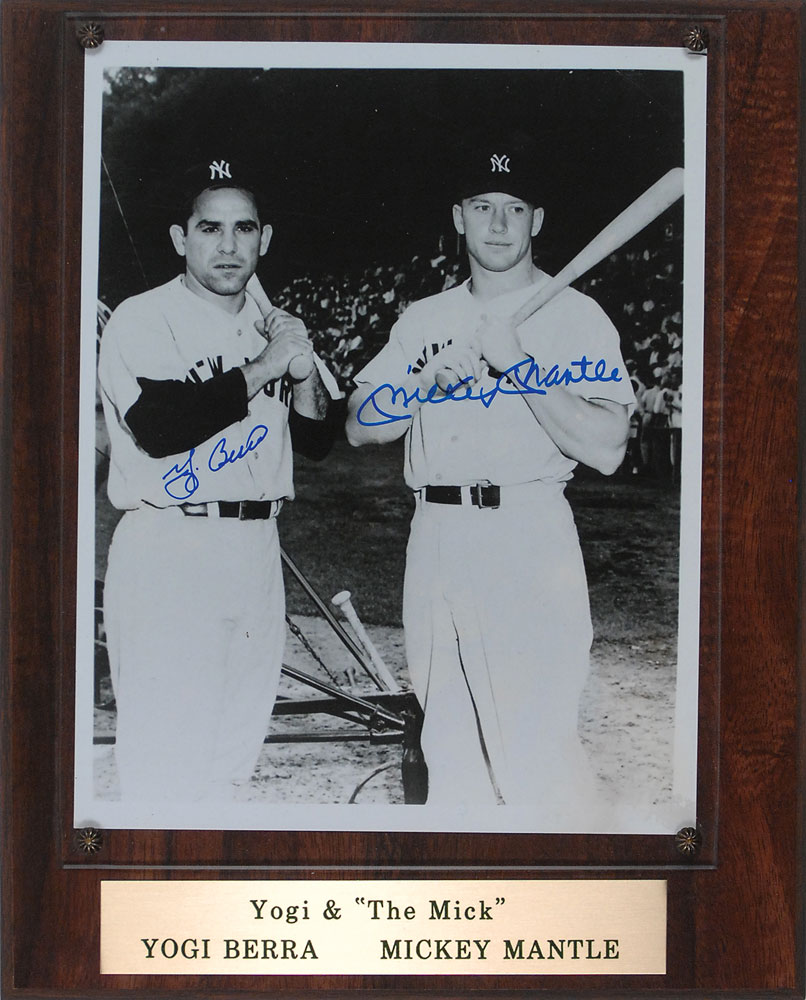 Glossy 8 x 10 photo of the Yankee legends with their bats, nicely signed in blue felt tip by both. Mounted behind Plexiglass to a wooden plaque to an overall size of 10.5 x 13. In fine condition, with some fingerprint marks to surface. Pre-certified Steve Grad/PSA/DNA and RR Auction COA.