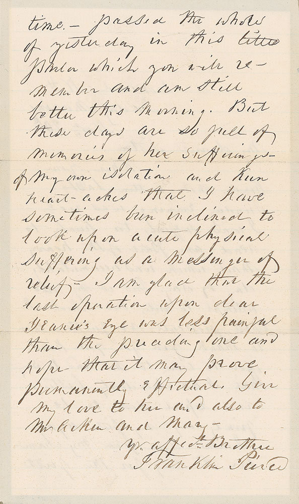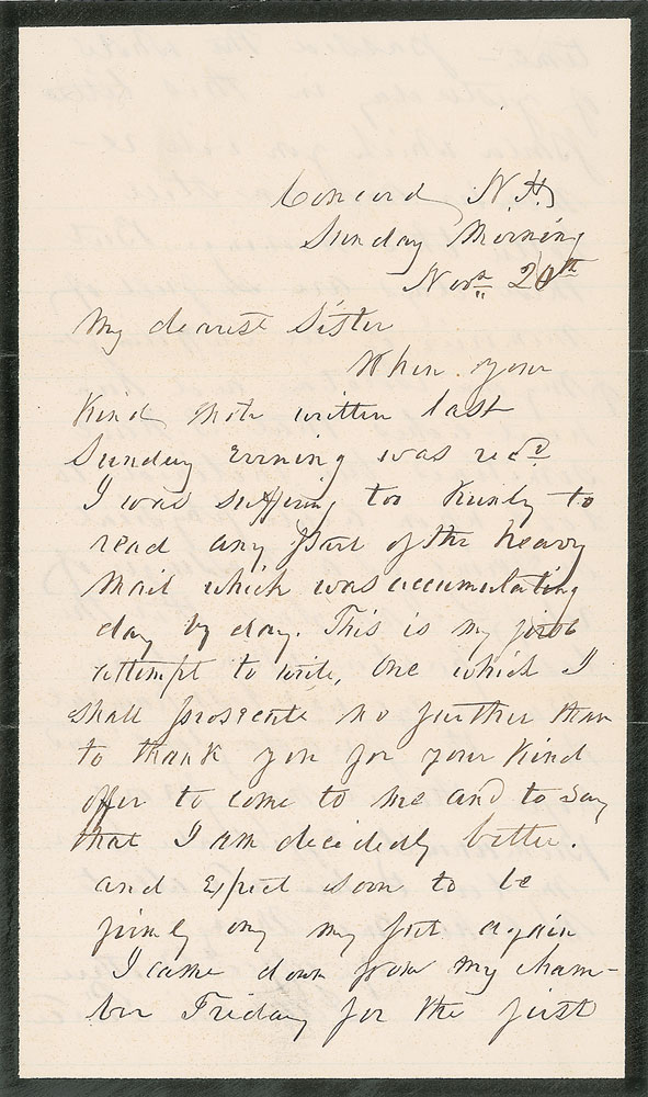 Scarce ALS, one page, lightly-lined both sides, 5 x 8.25, black-bordered mourning stationery letterhead, November 20. Letter to his sister. In full: “When your kind note written last Sunday evening was rec’d I was suffering too keenly to read any part of the heavy mail which was accumulating day by day. This is my first attempt to write, one which I shall prosecute no further than to thank you for your kind offer to come to me and to say that I am decidedly better. And expect to soon to be firmly on my feet again. I came down from my chamber Friday for the first time—passed the whole of yesterday in this little parlor which you will remember and am still better this morning. But these days are so full of memories of her suffering—of my own isolation and keen heart-aches that I have sometimes been inclined to look upon acute physical suffering as a messenger of relief. I am glad the last operation upon dear Jeanie’s eye was less painful than the preceding one and hope that it may prove permanently effectual.” In fine condition.