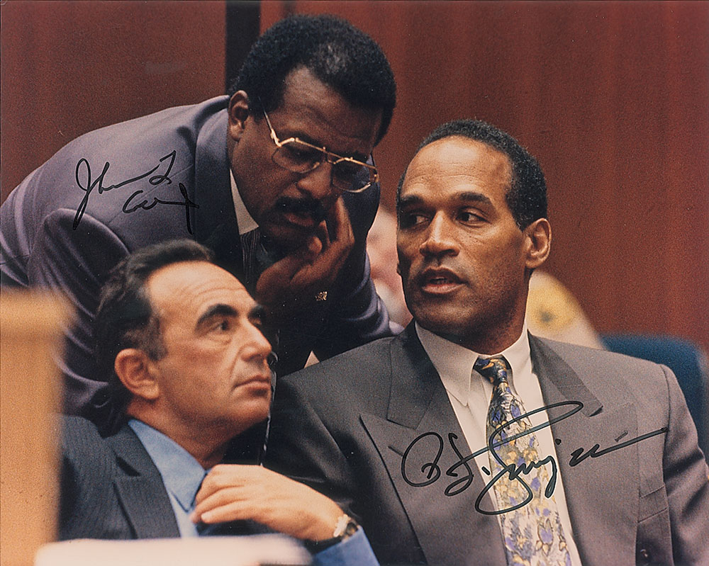 Color satin-finish 10 x 8 photo of Simpson conferring with members of his dream team during his murder trial, signed in black felt tip by Simpson and Cochran. In fine condition. Pre-certified Steve Grad/PSA/DNA and RR Auction COA.