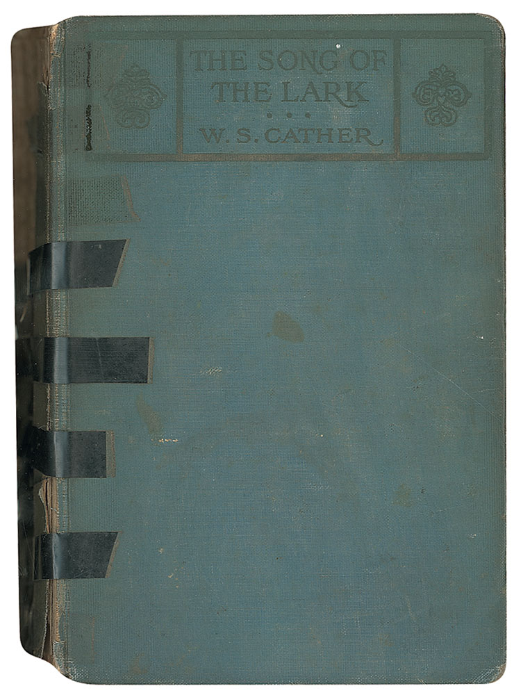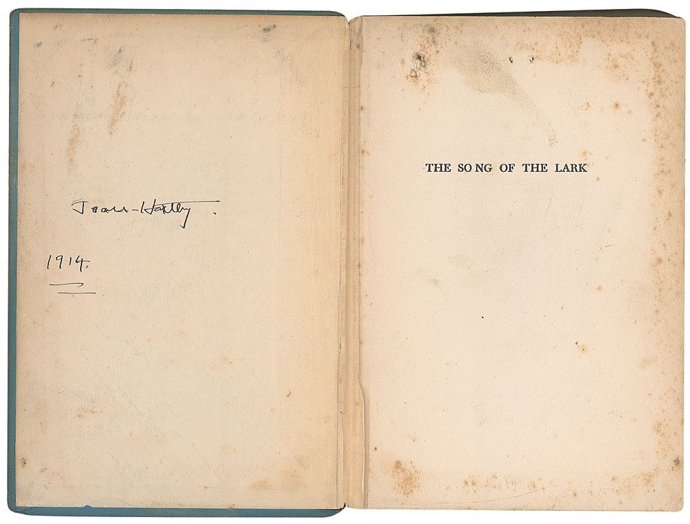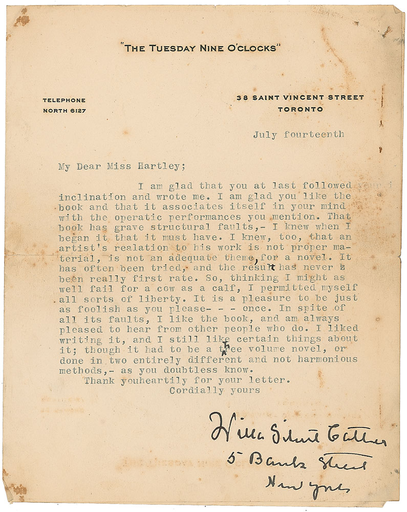 TLS signed with her uncommon full name, “Willa Sibert Cather,” one page, 6.5 x 8, The Tuesday Nine O’Clocks letterhead, July 14. Letter to Joan Hartley, in full: “I am glad that you at last followed inclination and wrote me. I am glad you like the book and that it associates itself in your mind with the operatic performances you mention. That book has grave structural faults, — I knew when I began it that it must have. I knew, too, that an artist’s relation to his work is not proper material, is not an adequate theme, for a novel. It has often been tried, and the result has never been really first rate. So, thinking I might as well fail for a cow as a calf, I permitted myself all sorts of liberty. It is a pleasure to be just as foolish as you please—once. In spite of all its faults, I like the book, and am always pleased to hear from other people who do. I liked writing it, and I still like certain things about it; though it had to be a three volume novel, or done in two entirely different and not harmonious methods,—as you doubtless know. Thank you heartily for your letter.” Under her uncommon full signature, Cather adds her mailing address. Reinforcement to reverse of central horizontal fold, scattered soiling and foxing, a couple staple holes, and light dampstaining, otherwise very good condition. Accompanied by Hartley’s copy of The Song of the Lark, with her name and incorrect date penned on the front pastedown. Book is in fair condition. Pre-certified PSA/DNA and RR Auction COA.