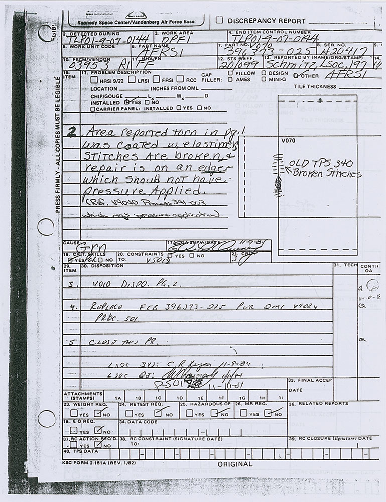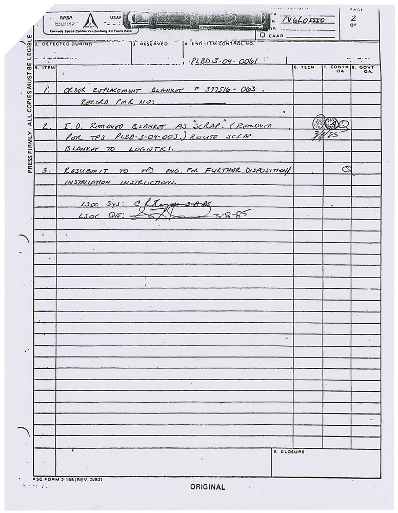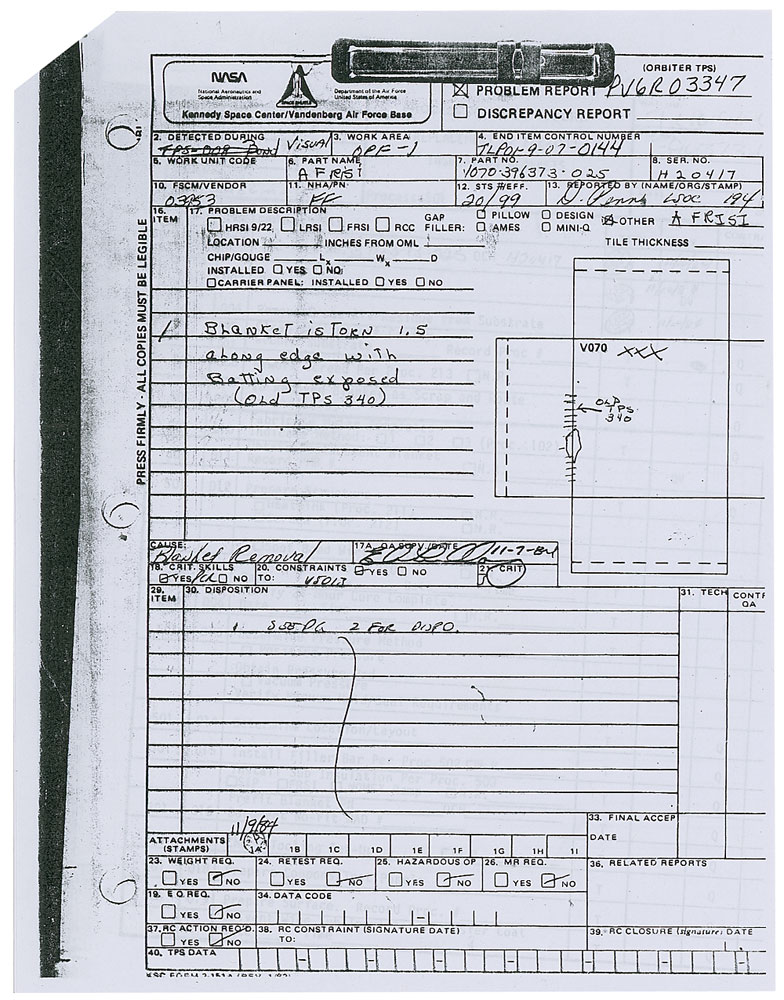 Available to US bidders only. Flown swatch of Fibrous Insulation Blanket (FIB), 5 x 3, used aboard Space Shuttle Challenger’s STS-41-G mission. In fine condition, with some fraying to edges. The section was cut from the original blanket, part number V070-396373-025, which was reported as torn with the batting exposed during post-flight inspection. Accompanied by photocopies of the original decommissioning tag and report. RR Auction COA.