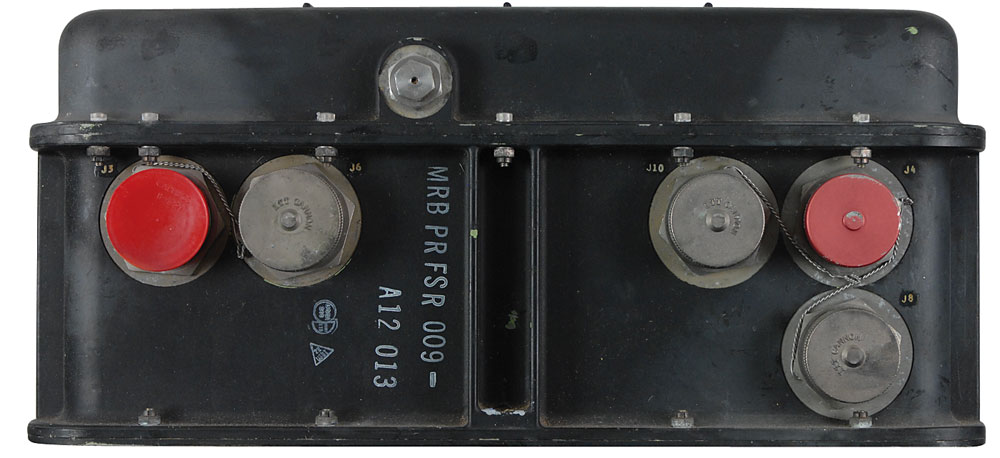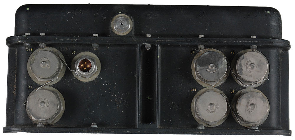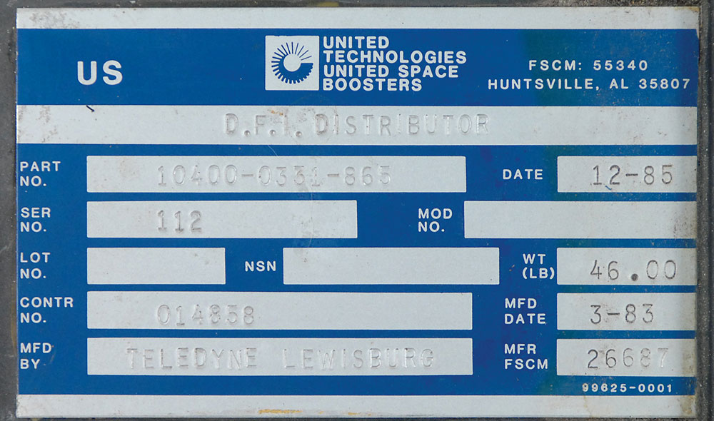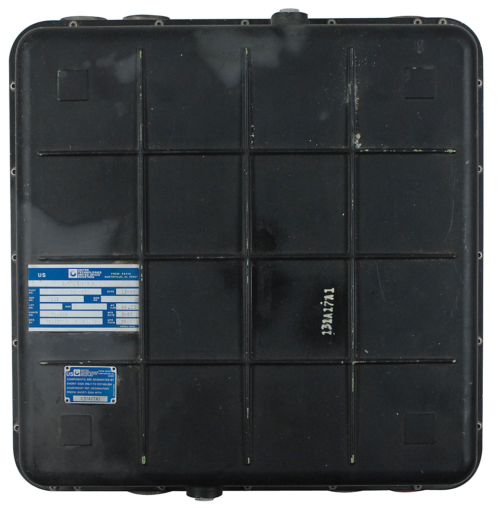 Development Flight Distributor Unit similar to one that flew as the main payload on shuttle mission STS-1. Unit measures 16 x 8 x 16 and weighs approximately 46 pounds. One side has a metal United Technologies United Space Boosters manufacturer’s label which reads, “D. F. I. Distributor,” Ser. No. “112,” Mfd by “Teledyne Lewisburg,” with a manufacture date of March 1983. Input and output plugs are present on two sides, 10 with caps. In fine condition. RR Auction COA.