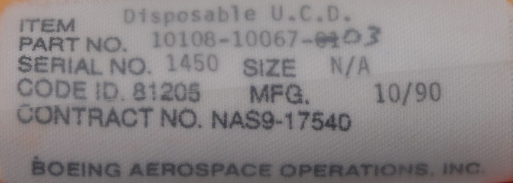 Shuttle-era EVA disposable Urine Collection Device (UCD), manufactured by Boeing. Device is stored in a sealed bag, along with an identification label on the device, along with a second label on the storage bag. RR Auction COA.