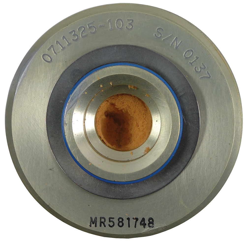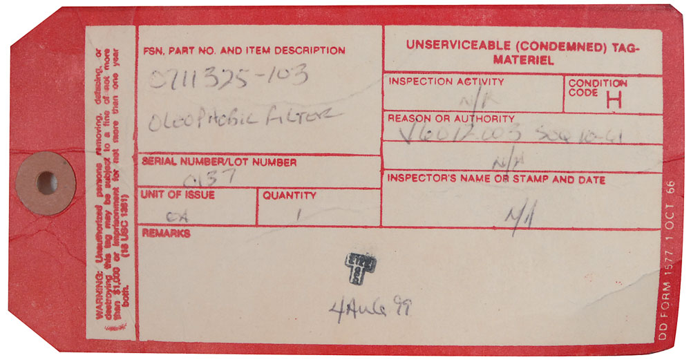 Flown oleophobic filter canister from a shuttle orbiter body flap, 5″ tall and 3″ in diameter, bearing engraved part numbers on top, “0711325-103 S/N 0137 MR581748.” Includes the original decommissioning tag, dated August 4, 1999. A dent to one side of the canister, otherwise fine condition. Flown status presumed by shuttle memorabilia specialist Ken Havekotte. RR Auction COA.