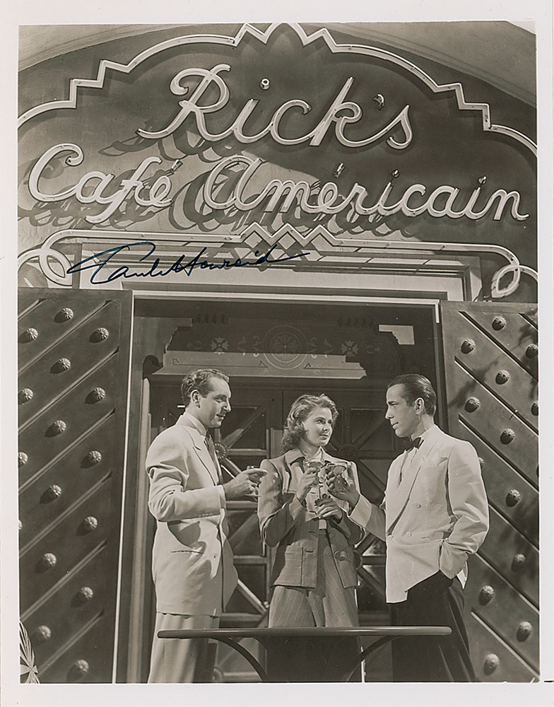 Glossy 8 x 10 photo of Henreid with Humphrey Bogart and Ingrid Bergman outside Rick’s Cafe in Casablanca, signed in black felt tip. In very fine condition. Pre-certified PSA/DNA and RR Auction COA.