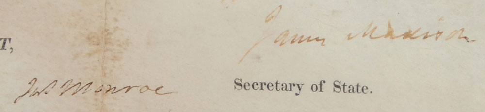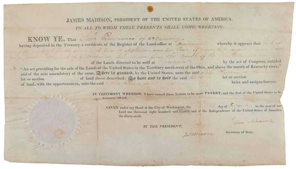 Partly-printed vellum DS, signed “James Madison” as president and “Jas. Monroe” as secretary of state, one page, 14.5 x 8.5, December 30, 1811. Land grant issued to John Purviance of Kentucky stating “He has made full payment for the South West Quarter of Section number Four…of the land lying between the Great Miami river and the Virginia reservation…directed by the act of Congress, entitled 'An act providing for the sale of the Lands of the United States in the Territory north-west of the Ohio, and above the mouth of the Kentucky River.'” In very good condition, with intersecting folds, one through a single letter of Monroe’s signature, handwritten portions fairly light, but legible, and some scattered light soiling. The white wafer seal is crisp and intact. Pre-certified John Reznikoff/PSA/DNA and RR Auction COA.