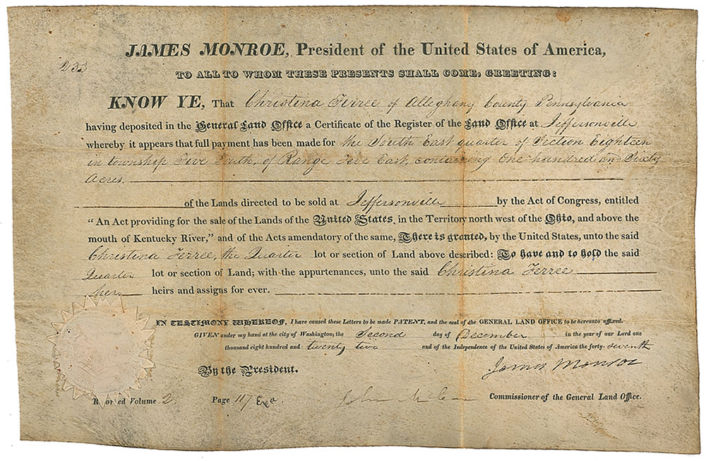 Partly-printed DS as president, one page, 13.75 x 9, December 2, 1822. Land grant issued to Christina Feree of Pennsylvania for 160 acres of land, signed at the conclusion by Monroe and countersigned by commissioner of the general land office. Intersecting folds, mild toning along the folds, and mild overall soiling, otherwise very good condition. The white wafer seal is worn, but intact. Pre-certified John Reznikoff/PSA/DNA and RR Auction COA.