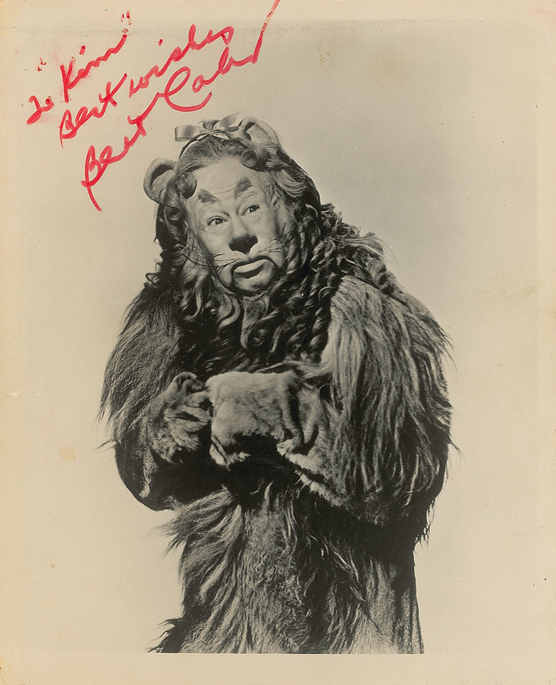 Highly sought after vintage glossy 8 x 10 photo of Lahr as the Cowardly Lion, signed and inscribed in red felt tip “To ‘Kim’ Best wishes, Bert Lahr.” In very good condition, with a small tear to the left edge (repaired on the reverse), scattered overall creasing, and a bit of brushing to the inscription. Signed photos of Lahr in his iconic role only occasionally appear for sale and are highly coveted by collectors. Pre-certified PSA/DNA and RR Auction COA.
