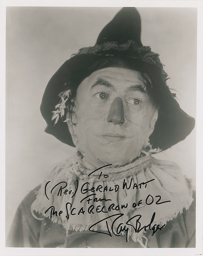 Glossy 8 x 10 photo of Bolger as the Scarecrow, signed and inscribed in black felt tip “To (Rev.) Gerald Watt from The Scarecrow of Oz, Ray Bolger.” In fine condition. Pre-certified PSA/DNA and RR Auction COA.