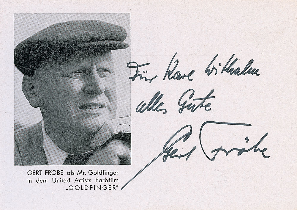 Uncommon 5.75 x 4 paperstock photo of Frobe as Goldfinger, signed and inscribed in German in black felt tip. In fine condition. Pre-certified PSA/DNA and RR Auction COA.