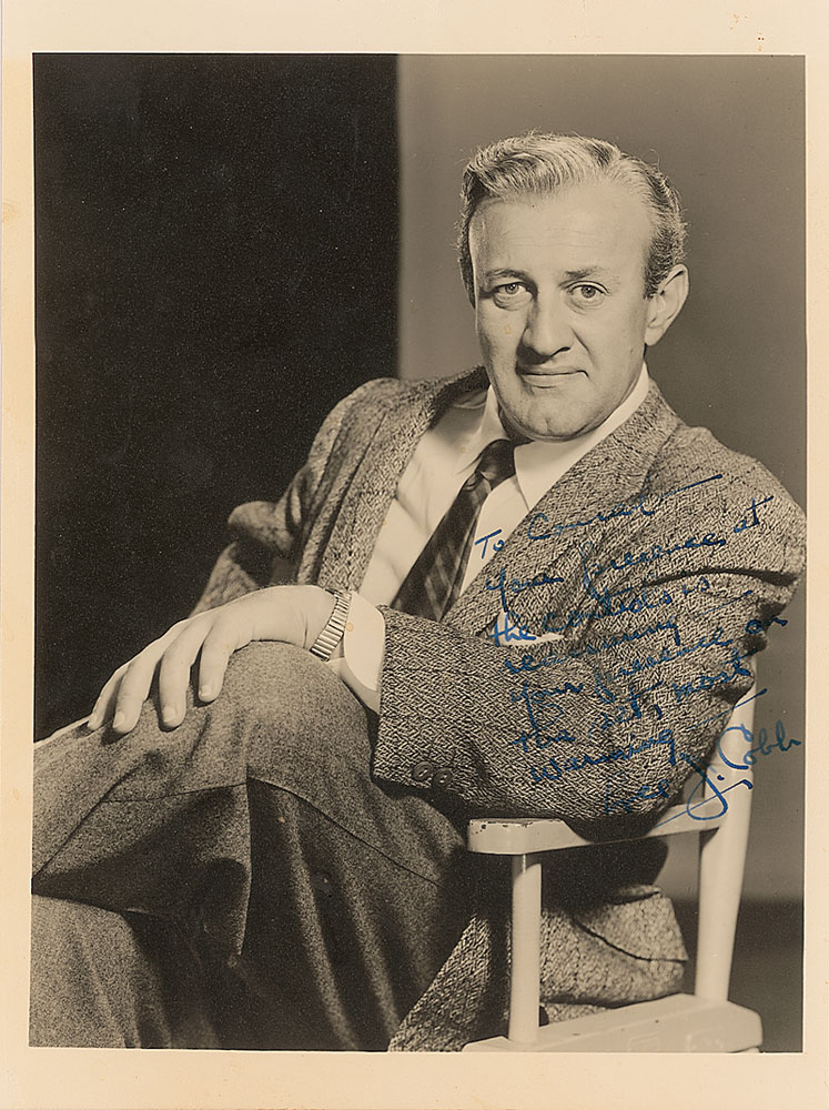 Vintage matte-finish 7.5 x 10 crystal-clear portrait of Cobb seated in a director’s chair, signed and inscribed in fountain pen, “To Conrad—Your presence at the controls is reassuring—your presence on the set, most warming—Lee J. Cobb.” In fine condition. Pre-certified PSA/DNA and RR Auction COA.