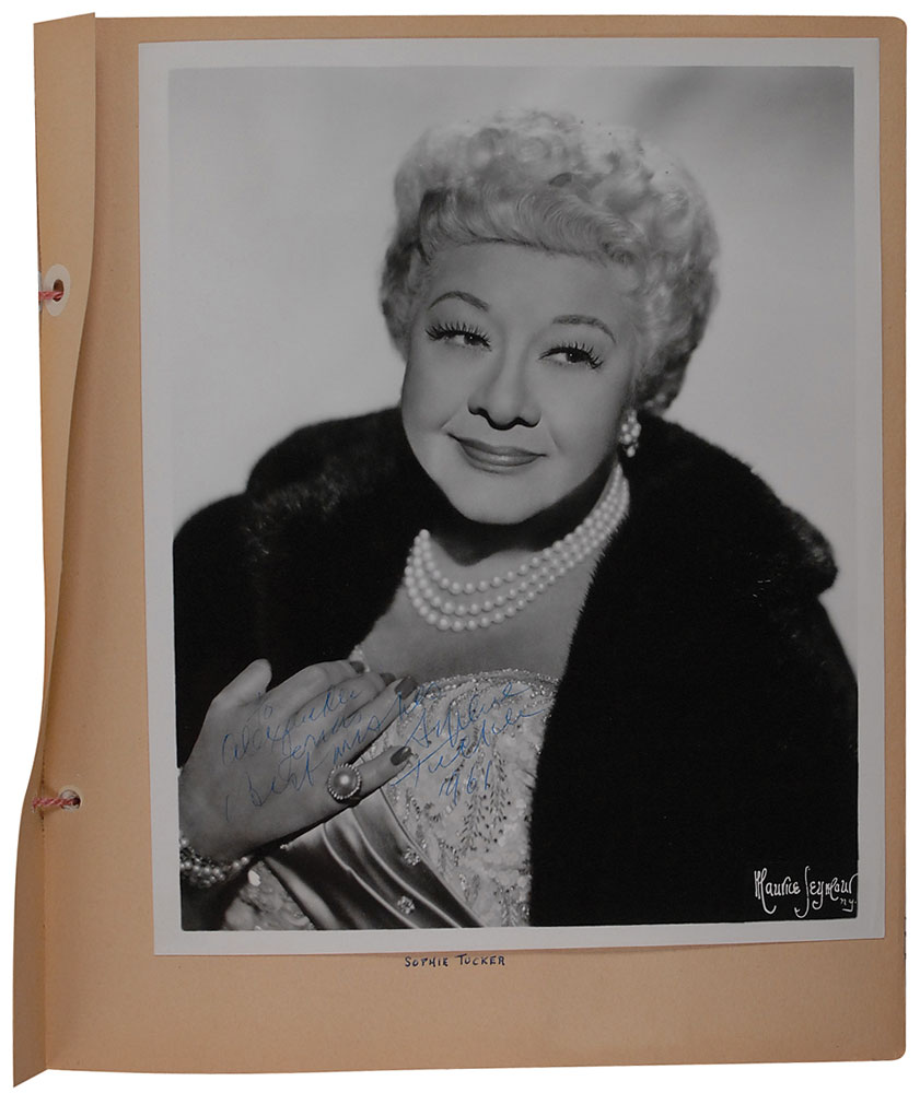 Huge scrapbook, 10 x 12, containing approximately 178 signed items from various 20th century entertainers, consisting primarily of ink signatures on individual affixed cards along with a few photos. Signers include: Orson Welles, Vivien Leigh and Laurence Olivier, Mae West (2), Bert Lahr, Bette Davis, Fred Astaire, Edwin Booth, Henry Irving, Richard Mansfield, Lotta Crabtree, Lionel Barrymore, George Arliss, Sophie Tucker, Walter Huston, Ethel Barrymore, Tallulah Bankhead, Helen Hayes, Claudette Colbert, Deborah Kerr, Charlton Heston, Rex Harrison, Mary Pickford, Douglas Fairbanks, Sr., Francis X. Bushman, Maurice Chevalier, Douglas Fairbanks, Jr., Feodor Chaliapin, Geraldine Farrar, and Marian Anderson. Signed items in overall fine condition, with various scattered toning; scrapbook in very good condition, with various loose and clipped pages.