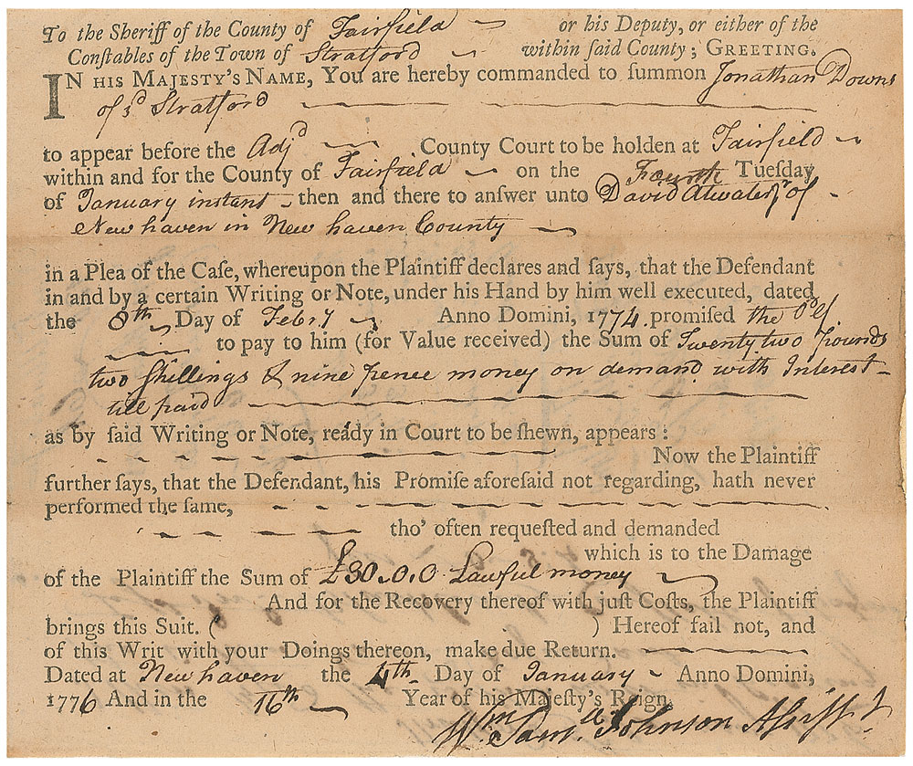 American statesman and signer of the Constitution (1727–1819) who played a key role in the debates at the Constitutional Convention. Partly-printed DS, signed “Wm. Saml. Johnson,” one page, 6 x 5, January 4, 1776. Document to the sheriff of Fairfield County, Connecticut, requiring him to summon “Jonathan Downs of Stratford to appear before the Adj’d County Court” to respond to a plaintiff’s lawsuit requesting £30.00 in damages. Affixed by the left edge to a slightly larger sheet. In fine condition, with some show-through from docketing to reverse. RR Auction COA.