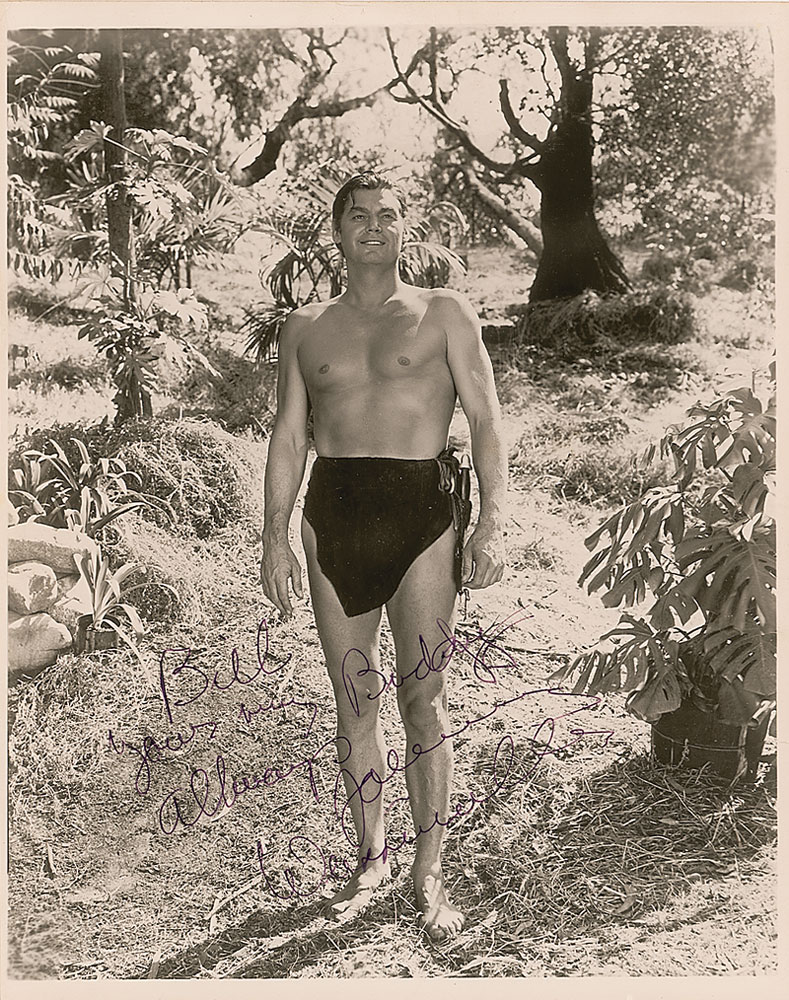Great vintage glossy 8 x 10 photo of Weissmuller wearing a loincloth as Tarzan, signed and inscribed in fountain pen, “Bill, You’re my Buddy always, Johnny Weissmuller.” In fine condition, with a possibly slightly trimmed left edge. Pre-certified PSA/DNA and RR Auction COA.