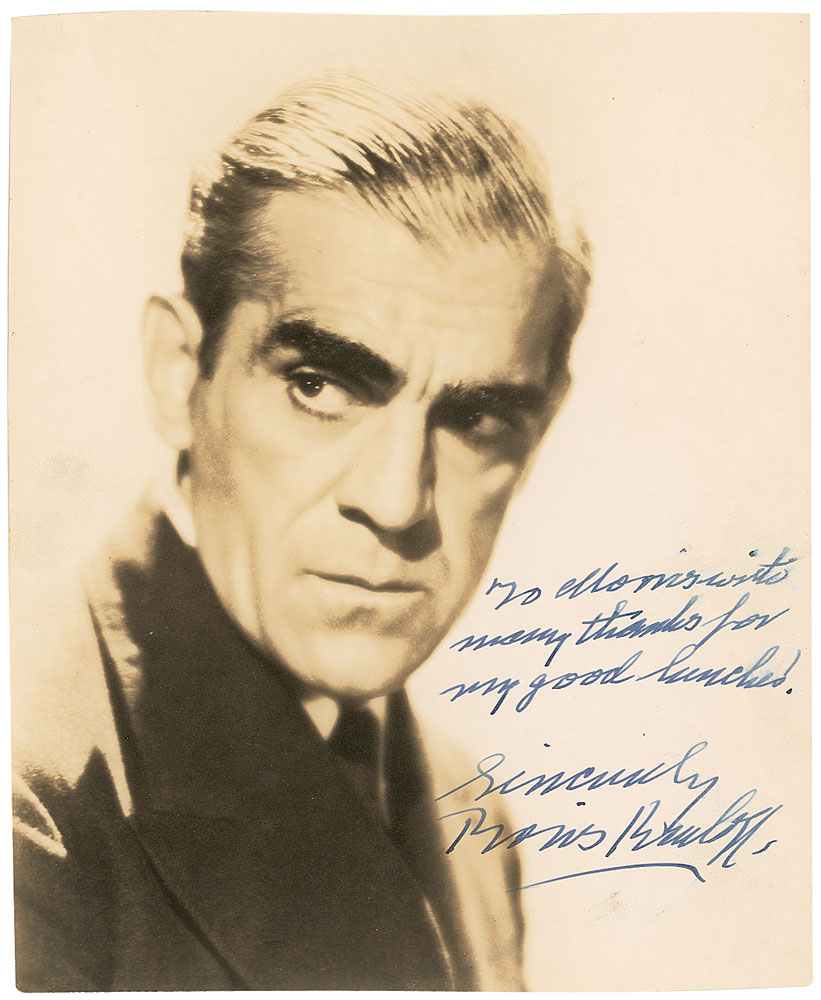 Terrific vintage matte-finish 7.75 x 9.25 portrait of Karloff, signed and inscribed in fountain pen, “To Morris, with many thanks for my good lunch! Sincerely, Boris Karloff.” In fine condition, with trimmed edges. A superb image with a well-placed signature, exhibiting excellent contrast against the white background. Pre-certified PSA/DNA and RR Auction COA.