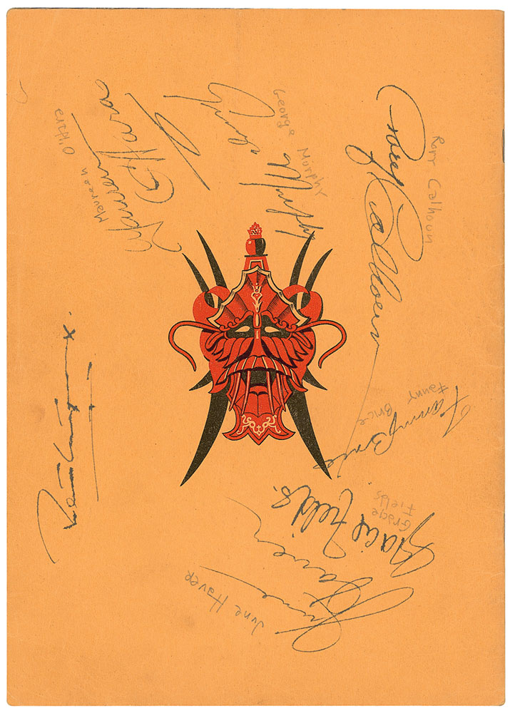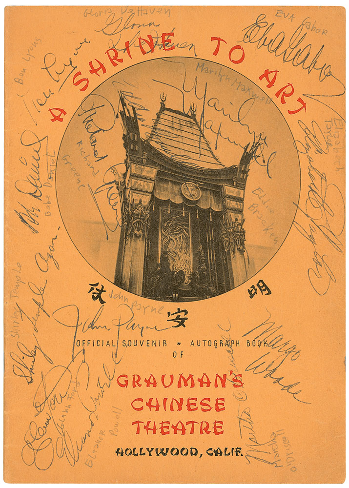Program from ‘A Shrine to Art’ at Grauman’s Chinese Theatre in 1938, 7.5 x 10.75, signed on the front and back covers in fountain pen by 21 stars. Signers are: Elizabeth Taylor, Shirley Temple, Robert Montgomery, Maureen O’Hara, Eva Gabor, Gloria DeHaven, Ben Lyon, Bebe Daniels, Richard Greene, Marilyn Maxwell, Eddie Bracken, John Payne, Glenn Ford, Eleanor Powell, Margo Woode, Martha O’Driscoll, George Murphy, Rory Calhoun, Fanny Brice, Gracie Fields, and June Haver. Most signatures are identified in pencil by the original collector. In fine condition. Pre-certified PSA/DNA and RR Auction COA.