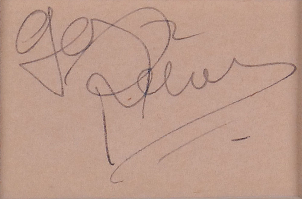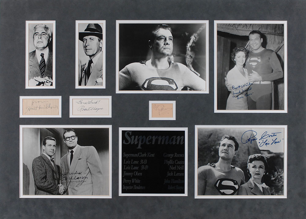 Collection of six Superman items: ballpoint signature, “George Reeves,” on an off-white 2 x 1.25 slip; pencil signature, “John Hamilton,” on an off-white 4 x 1.5 lined slip; ballpoint signature, “Good luck! Robert Shayne,” on an off-white 3.5 x 1.5 card; and three glossy photos, 7 x 9 and 9 x 7, individually signed in black felt tip by Phyllis Coates, Noel Neill, and Jack Larson. All are nicely double-suede-matted together with unsigned photos of Reeves, Hamilton, and Shayne to an overall size of 32 x 23. In overall fine condition. Reeves and Hamilton signatures are quite rare and highly desirable, and all six items are impressively presented in this large display. Oversized. RR Auction COA.