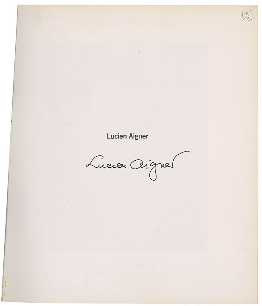 Signed book: Lucien Aigner. NY: International Center for Photography, 1979. Hardcover, 7.5 x 9, 127 pages. Signed on the half-title page in black ink. In fine condition, with diagonal bends to opening pages, none affecting the signature. RR Auction COA.