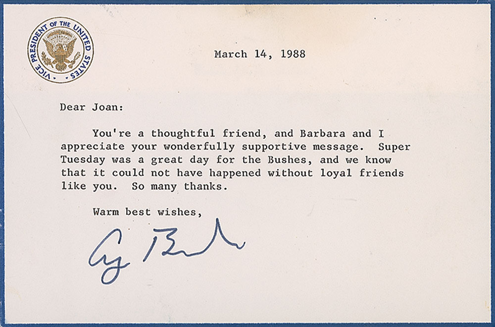 TLS, one page, 6.25 x 4, Vice President letterhead, March 14, 1988. Letter to Joan Johnson. In part: “Barbara and I appreciate your wonderfully supportive message. Super Tuesday was great for the Bushes, and we know that it could not have happened without loyal friends like you.” Letter and the original mailing envelope are affixed to a 7.5 x 9 board. In fine condition, with a bit of mild toning along top edge from adhesive on reverse. RR Auction COA.