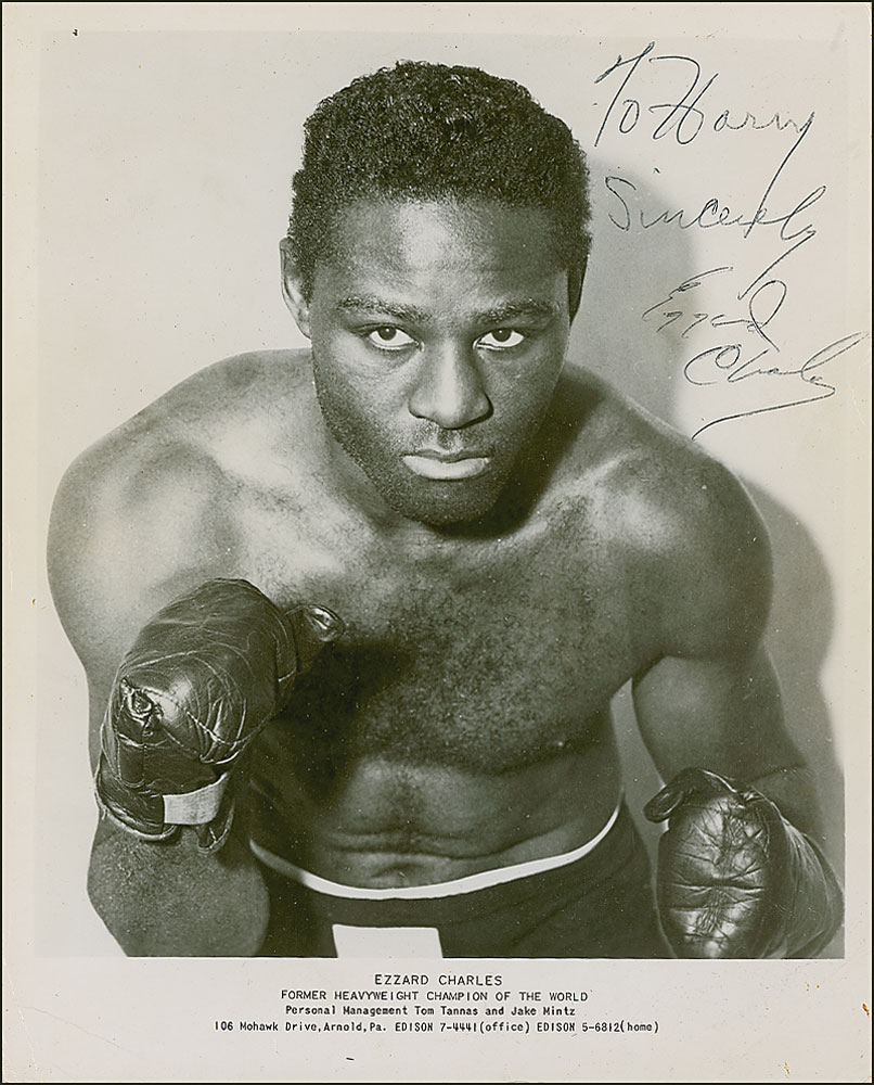Former heavyweight champion of the world. Vintage glossy 8 x 10 publicity photo, signed and inscribed in black ballpoint, “To Harry, Sincerely, Ezzard Charles.” In very good condition, with some light skipping to signature and inscription, and scattered light creases, surface marks, and impressions. Pre-certified Steve Grad/PSA/DNA and RR Auction COA.