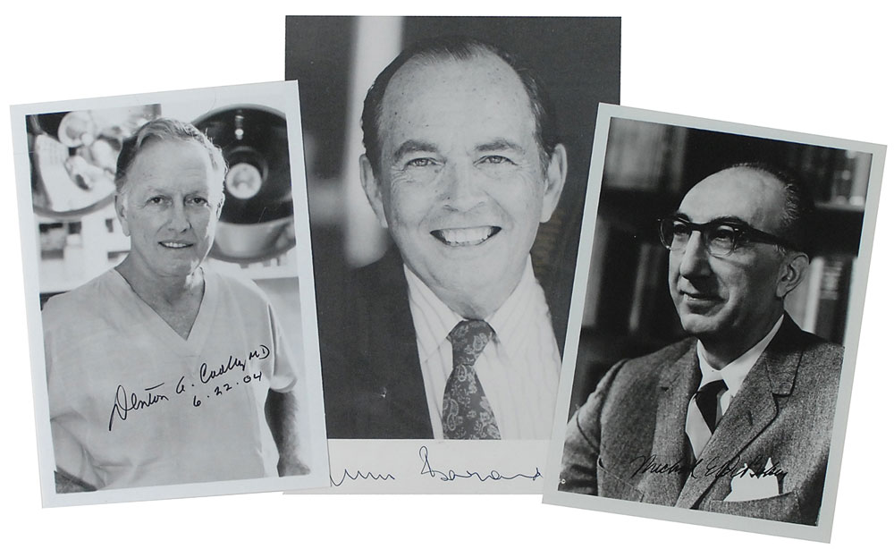 Three photos, two glossy 5 x 7 and a 6 x 8.25 cardstock, each signed in felt tip or ink by the surgeon pictured. Signers are: Christiaan Barnard, Denton Cooley, and Michael DeBakey. In fine condition, with a diagonal crease to Barnard’s photo, lightly affecting a portion of the signature. RR Auction COA.