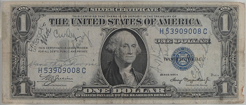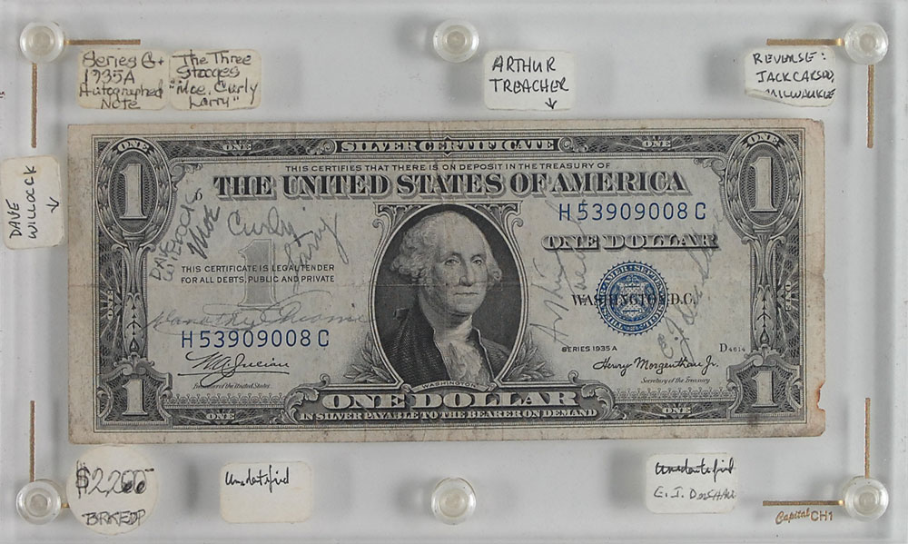 Series 1935 A one dollar bill, signed on the portrait side in fountain pen on the blank light portion, “Moe,“ “Larry,” and “Curly.” Bill is signed by five others including Arthur Treacher. In fine condition, with central horizontal and vertical folds and expected light wrinkling and age wear. Pre-certified PSA/DNA and RR Auction COA.
