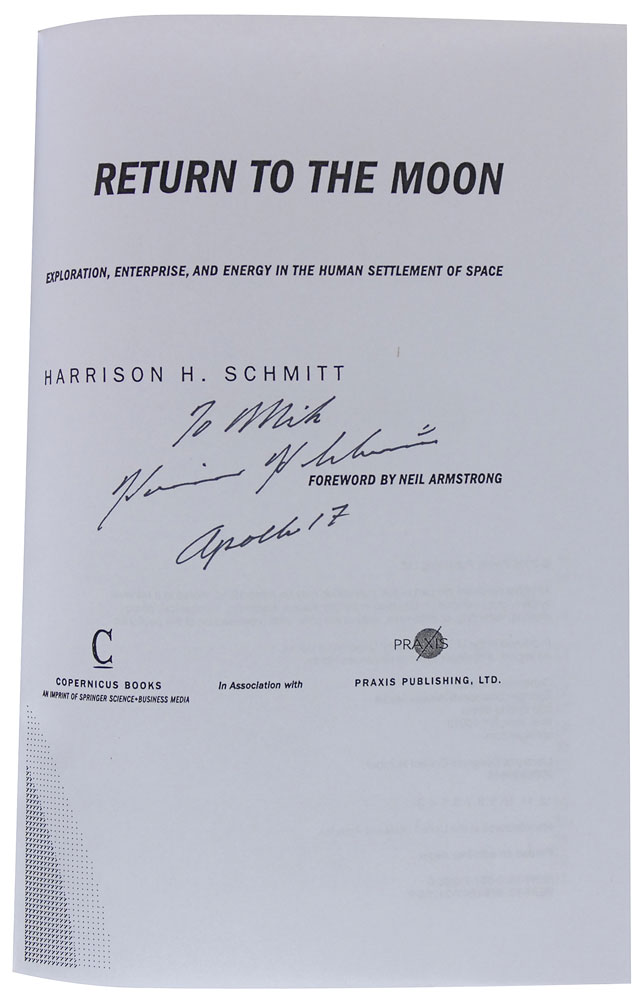 Signed book: Return to the Moon. First edition, later printing. NY: Copernicus Books, 2006. Hardcover, 6.5 x 9.5, 335 pages. Signed and inscribed on the title page in black felt tip, “To Mike, Harrison H. Schmitt, Apollo 17.” In fine condition. Pre-certified Steve Zarelli and RR Auction COA.